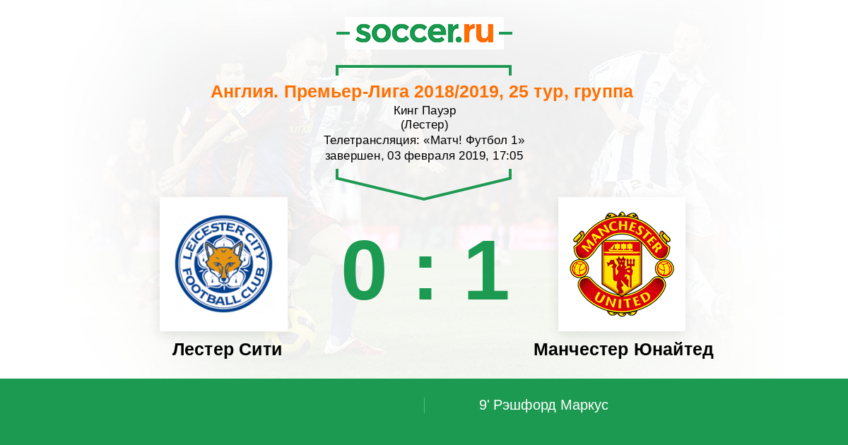 Все! Матч завершен! "Манчестер Юнайтед" одержал гостевую победу над "Лестером" со счетом 1:0 благодаря единственному голу Маркуса Рэшфорда в дебюте поединка. Для Вас прямую онлайн-трансляцию этого поединка провел Андрей Бабенчук. Оставайтесь на https://www.soccer.ru/!