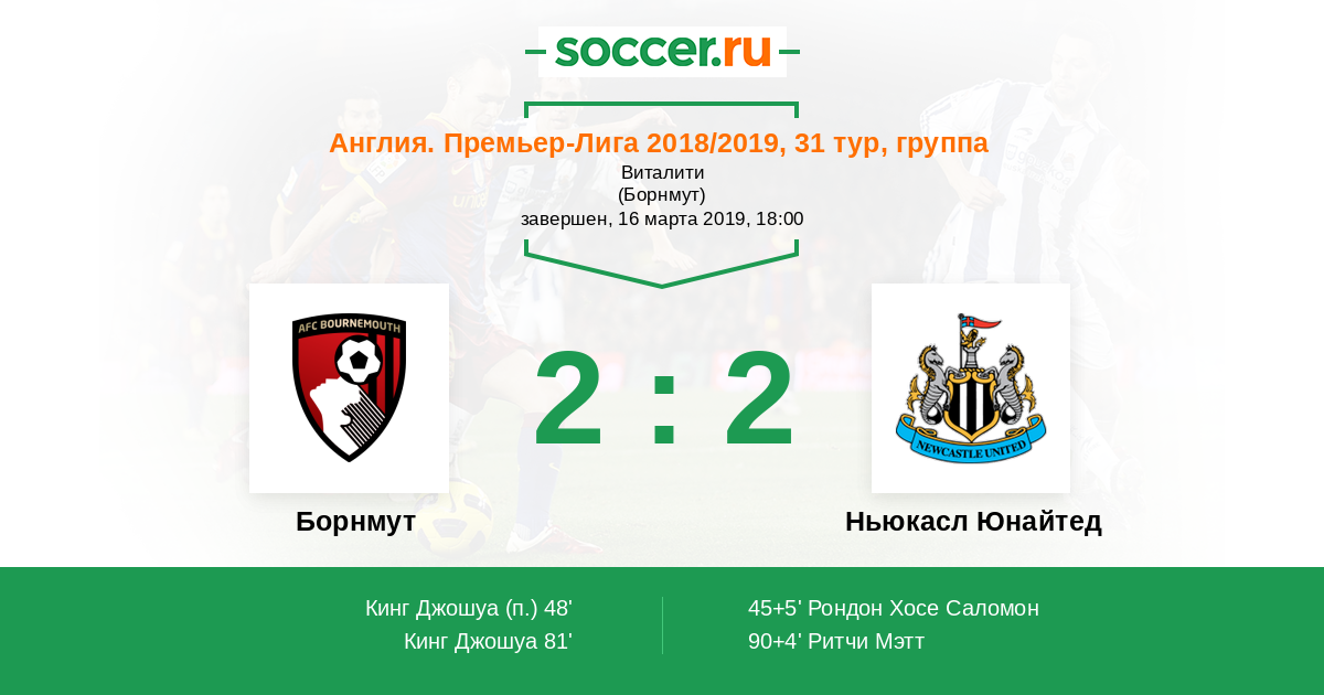 Пол Дамметт (Ньюкасл Юнайтед) нанес удар после того, как подобрал мяч на рикошете. Но мяч прошел выше ворот. Мяч покинул пределы поля. Борнмут введет мяч в игру ударом от ворот.