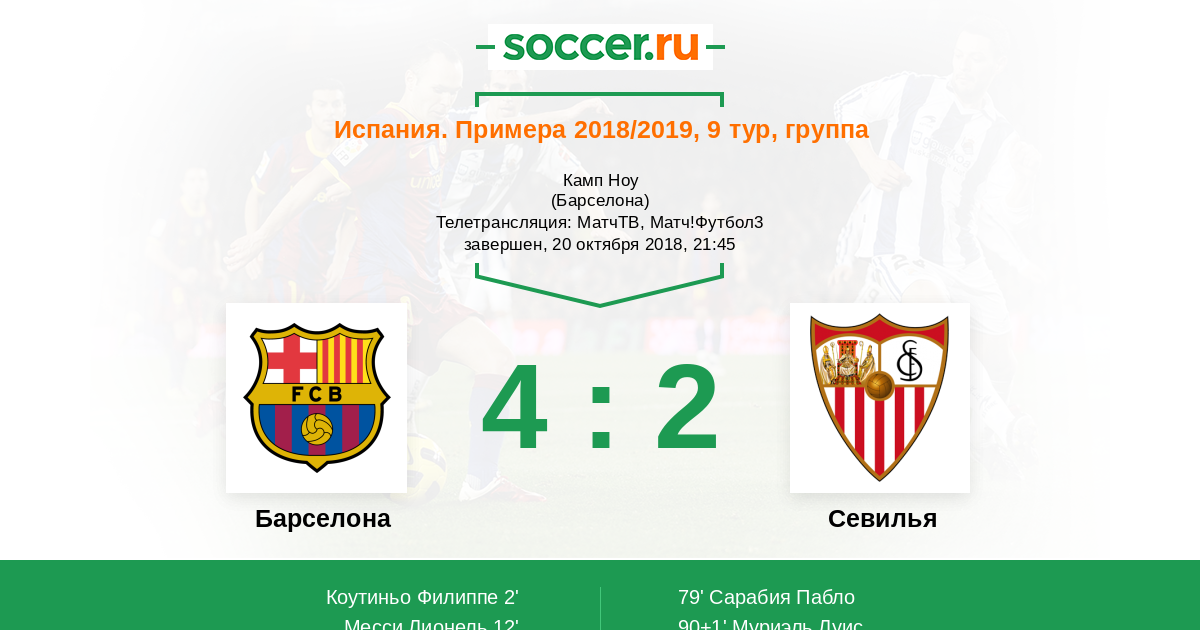 Доброго времени суток, уважаемые любители футбола! Рады приветствовать Вас на текстовой онлайн-трансляции матча девятого тура Ла Лиги, в котором "Барселона" сыграет с "Севильей". Встреча пройдет в Барселоне на стадионе "Камп Ноу". Обслужит матч бригада арбитров во главе с Хуаном Мартинесом Мунуэрой.