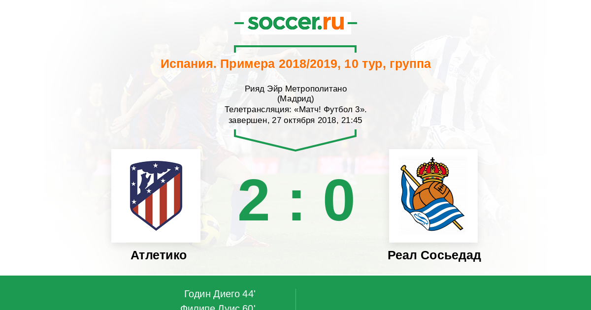 Добрый вечер, уважаемые любители испанского футбола! "Атлетико" Мадрид принимает сегодня "Реал Сосьедад" и в случае победы может возглавить турнирную таблицу Примеры. Между сентябрьской и октябрьской паузой на матчи сборных "Атлетико" выдал вполне себе симпатичную беспроигрышную серию. Если бы ещё не странная домашняя ничья с "Эйбаром" (1:1), так и вовсе получился бы очень даже годный отрезок. В этом поединке "Атлетико" попробует реабилитироваться за сокрушительное фиаско в Лиге Чемпионов. Сумеет ли что-то противопоставить "матрасникам" "Реал Сосьедад"? Сайт https://www.soccer.ru проведёт прямую текстовую онлайн трансляцию матча, следить за событиями на поле и комментировать игру для вас будет Старчеус Сергей.