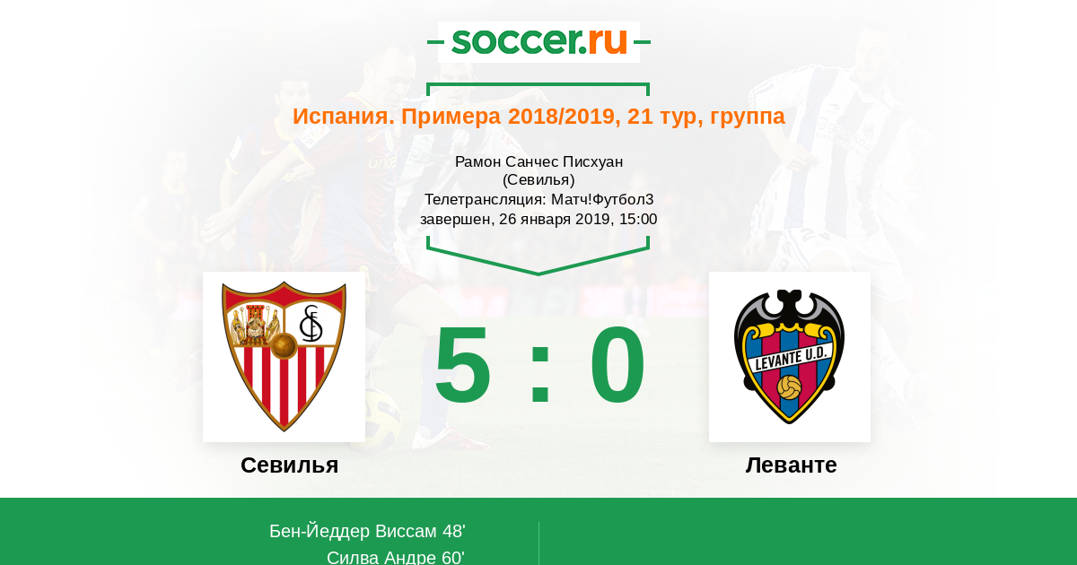 Доброго времени суток, уважаемые любители футбола! Рады приветствовать Вас на текстовой онлайн-трансляции матча двадцать первого тура Примеры, в котором "Севилья" сыграет с "Леванте". Встреча пройдет в Севилье на стадионе "Рамон Санчес Писхуан". Обслужит матч бригада арбитров во главе с Хавьером Рохасом.