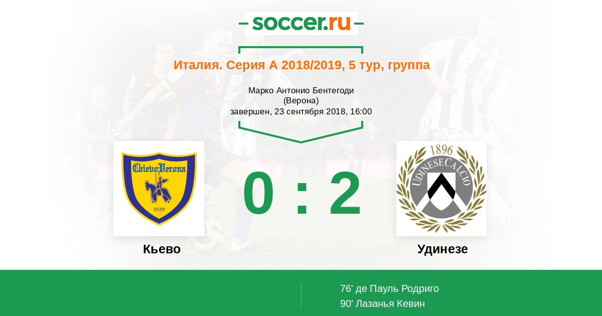 Никола Риго (Кьево) прошел сквозь оборону, и оказался в отличной позиции для удара. Он бьет под перекладину, но не попадает. Мяч покинул пределы поля. Удинезе введет мяч в игру ударом от ворот.