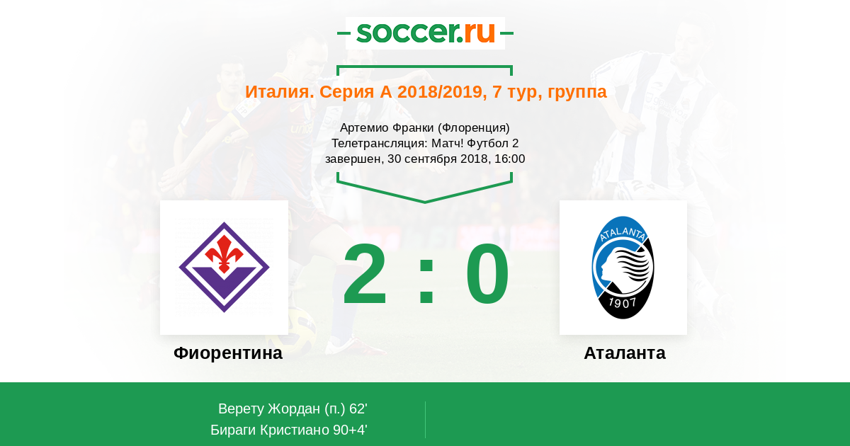 Герман Песселья (Фиорентина) уронил соперника. Если Паоло Валери еще раз увидит такое нарушение, то, скорее всего, покажет карточку. Аталанта зарабатывает право на штрафной с хорошей точки.
