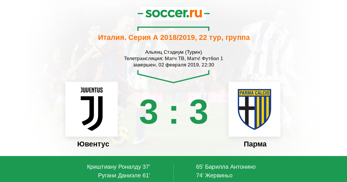 В 22-м туре итальянской Серии А "Ювентус" на своём поле примет "Парму". Два последних матча "Ювентус" провёл очень слабо, за что наверняка постарается реабилитироваться в поединке с "Пармой". Как в итоге закончится матч? Сайт https://www.soccer.ru проведёт прямую текстовую онлайн трансляцию матча, следить за событиями на поле и комментировать игру для вас будет Старчеус Сергей.