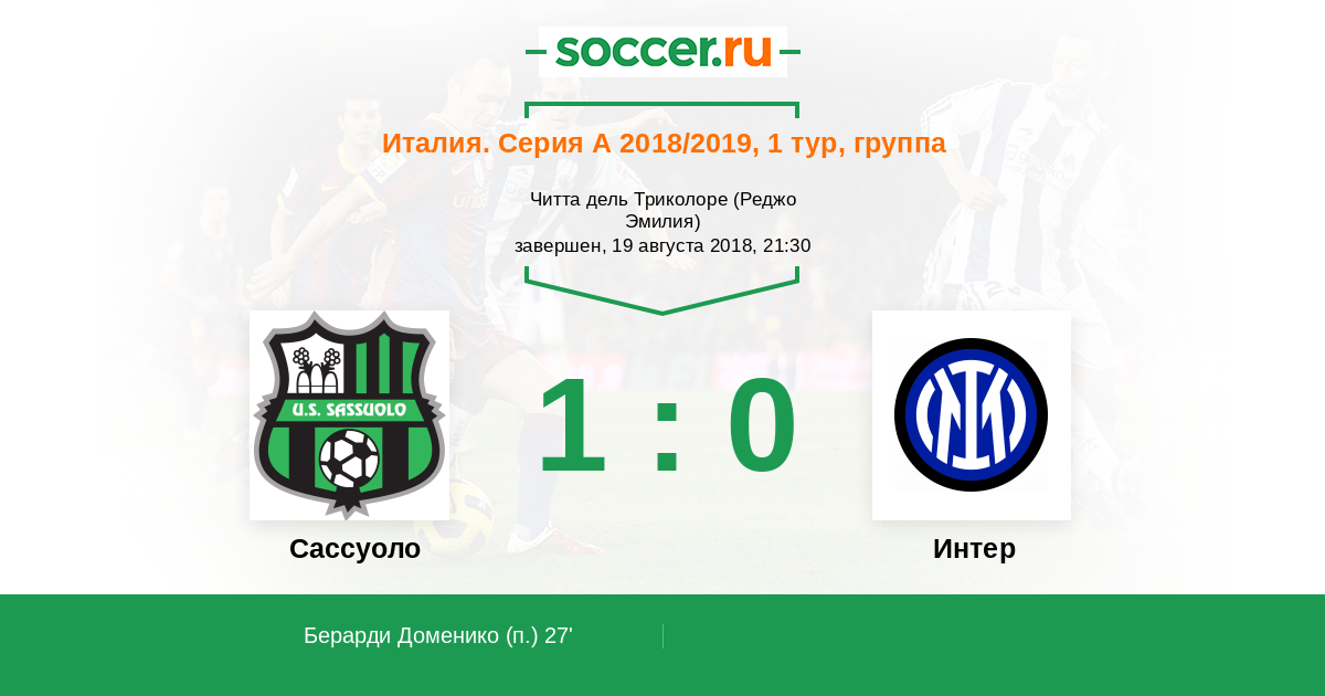 Доменико Берарди (Сассуоло) убежал в сольный проход, но не смог создать опасный момент - защитники в итоге хорошо сыграли. Мяч ушел за пределы поля. Сассуоло получает право на угловой.