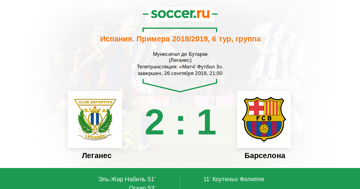 Добрый вечер, уважаемые любители испанского футбола! В 6-м туре Примеры "Леганес" будет принимать претендента на чемпионство "Барселону". Остаётся только посочувствовать хозяевам поля. "Барселона" после потери очков будет стремиться к реабилитации. "Леганес" пока не подаёт особых признаков жизни. "Леганес" остаётся одной из трех команд Ла Лиги, которые в нынешнем сезоне ещё не побеждали, и ведь продолжение безвыигрышной серии ой как светит. Сайт https://www.soccer.ru проведёт прямую текстовую онлайн трансляцию матча, следить за событиями на поле и комментировать игру для вас будет Старчеус Сергей.