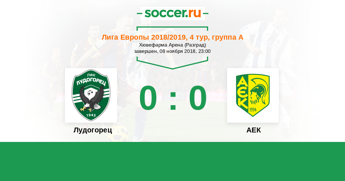 Jean Luc Gbayara (AEK Ларнака) нанес удар по воротам, но промахнулся довольно сильно. Мяч покинул пределы поля. Лудогорец введет мяч в игру ударом от ворот.