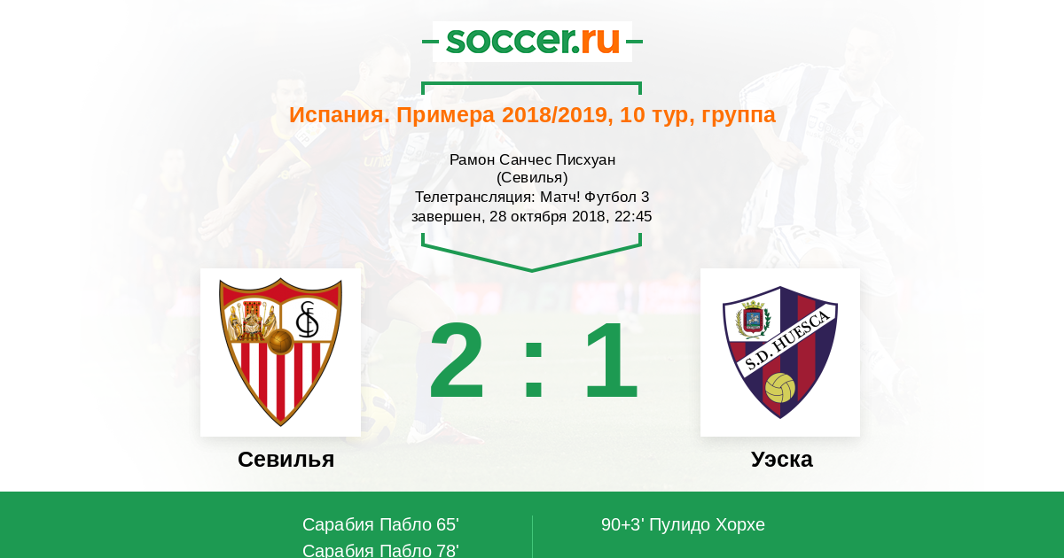 Пабло Сарабия (Севилья) получает великолепную передачу и оказывается один перед голкипером. Хладнокровно переигрывает его, отправляя мяч в сетку.