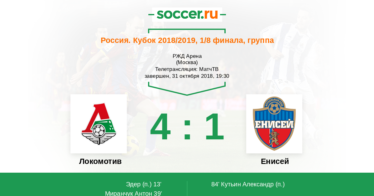 Доброго времени суток, уважаемые любители футбола! Рады приветствовать Вас на текстовой онлайн-трансляции матча 1/8 Кубка России, в котором "Локомотив" сыграет с "Енисеем". Встреча пройдет в Москве на стадионе "РЖД Арена". Обслужит матч бригада арбитров во главе с Алексеем Сухим.