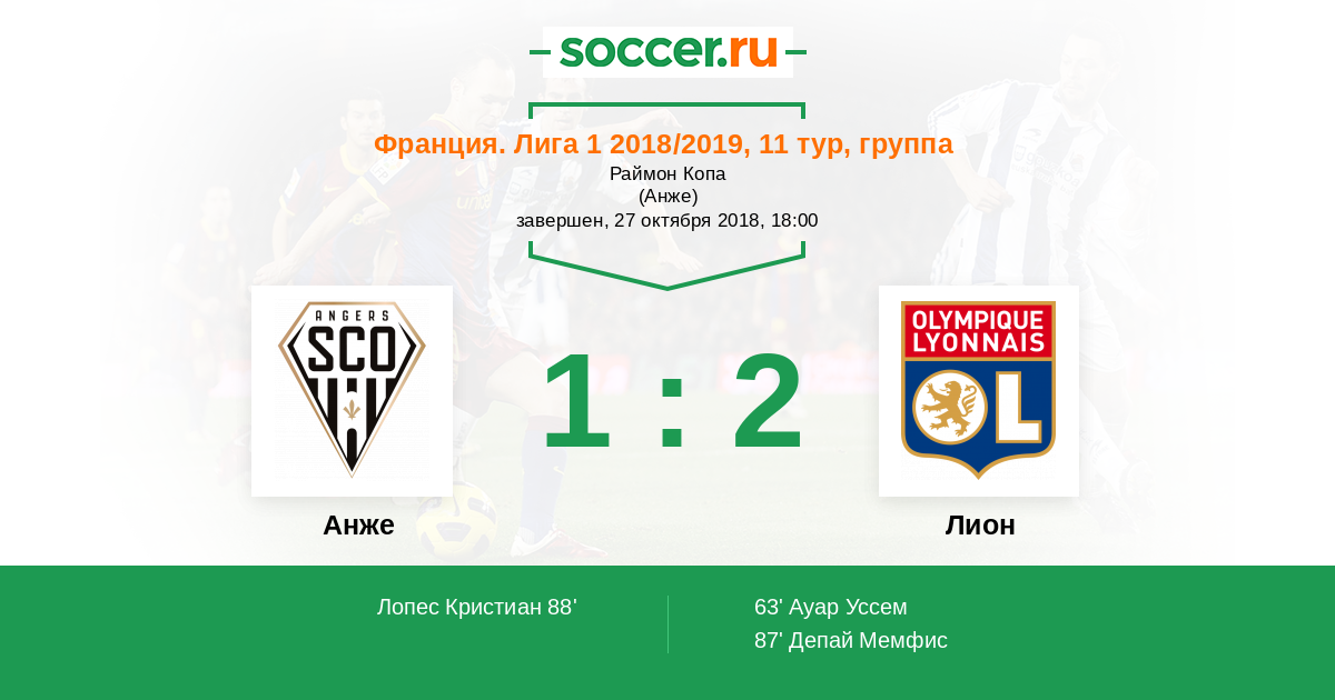 ГОЛ! Хуссем Ауар (Лион) наносит точный удар головой, и счет становится 0:1. Мемфис Депай сделал голевую передачу.