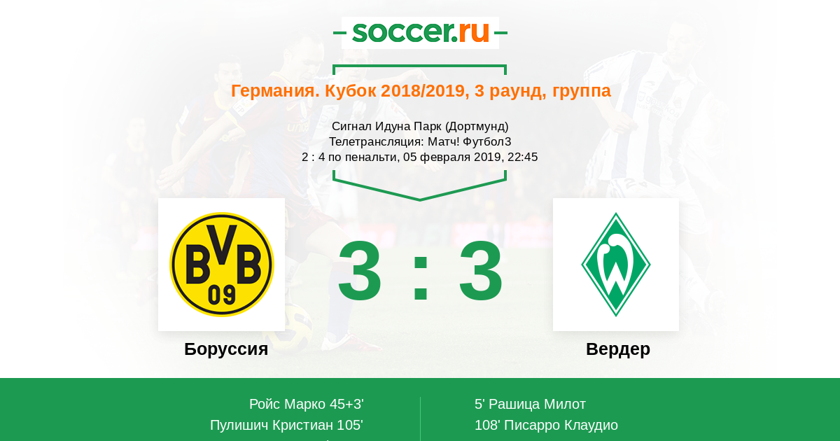 Доброго времени суток, уважаемые любители футбола! Рады приветствовать Вас на текстовой онлайн-трансляции матча третьего раунда Бундеслиги, в котором "Боруссия" из Дортмунда сыграет с "Вердером". Встреча пройдет в Дортмунде на стадионе "Сигнал Идуна Парк". Обслужит матч бригада арбитров во главе с Феликсом Брыхом.