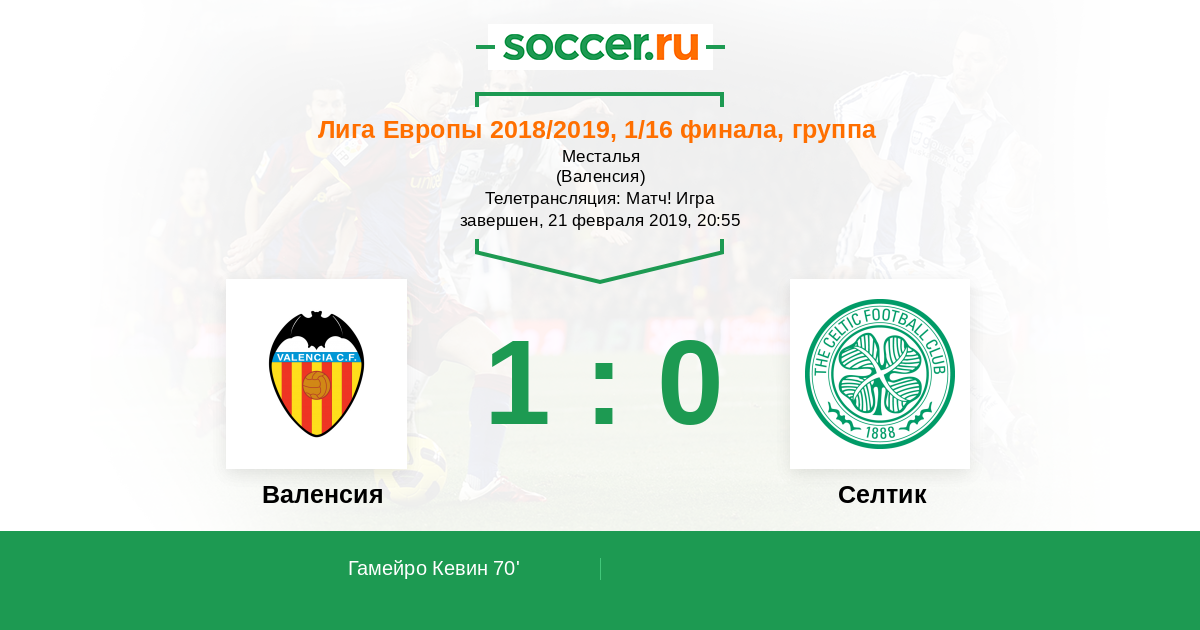 Кристоффер Айер (Селтик) обыграл защитника и оказался первым на мяче внутри штрафной, а затем пробил, но намного выше ворот. Мяч ушел за линию ворот, и вратарь команды Валенсия произведет удар от ворот.