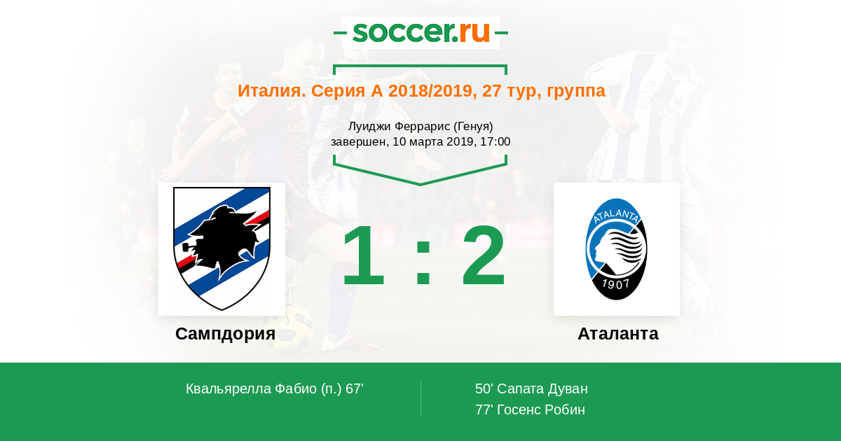 Маноло Габбьядини (Сампдория) занял хорошую позицию в штрафной площади после паса, но отправил мяч мимо левой штанги. Мяч покинул пределы поля. Аталанта введет мяч в игру ударом от ворот.