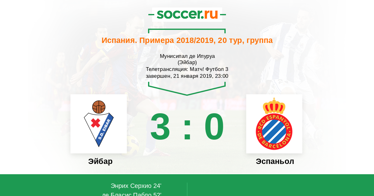 Отличный пас, и Серхио Энрич (Эйбар) из штрафной наносит удар. Выстрелу не хватило точности и мяч прошел мимо ворот. Мяч покинул пределы поля. Эспаньол введет мяч в игру ударом от ворот.