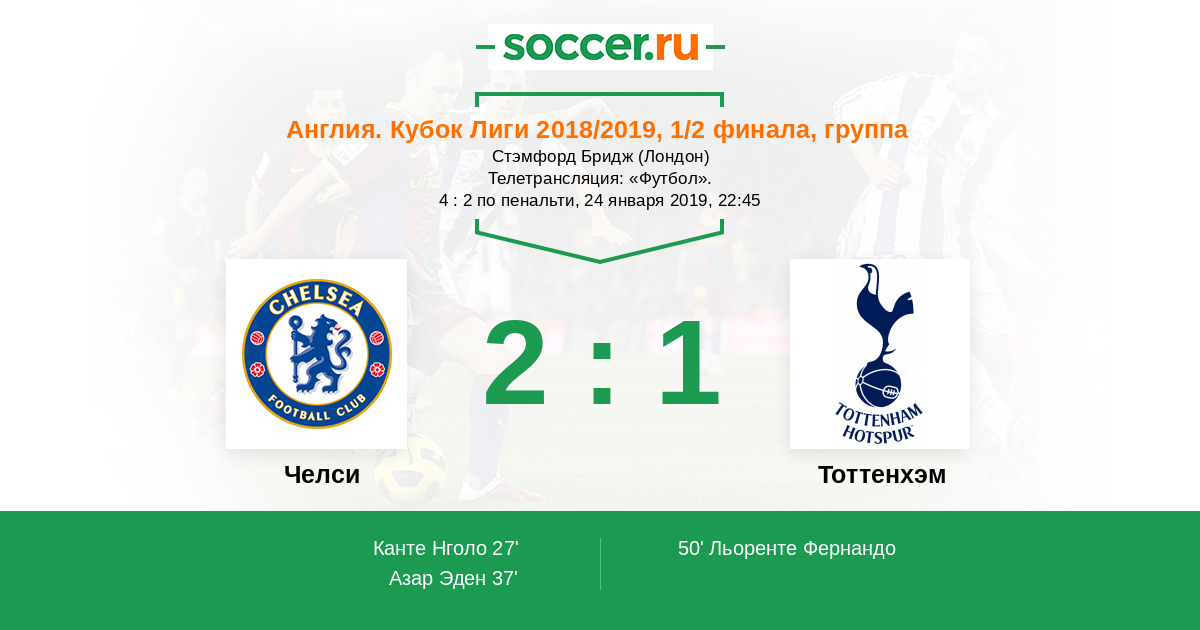 В ответном полуфинальном матче Кубка Лиги "Тоттенхэм" попробует удержать добытое преимущество в противостоянии с "Челси". Один претендент на завоевание трофея досрочно определился, а за вторую путёвку в финал престижного турнира предстоит ожесточённая борьба. Выделить фаворита предстоящего поединка не так просто. Сайт https://www.soccer.ru проведёт прямую текстовую онлайн трансляцию матча, следить за событиями на поле и комментировать игру для вас будет Старчеус Сергей.