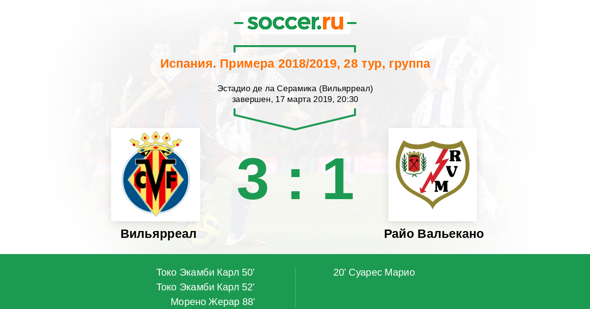 Навес с углового, и Марио Суарес (Райо Вальекано) находится в нужном месте в нужное время, вбивает головой мяч в девятку. Счет теперь 0:1.