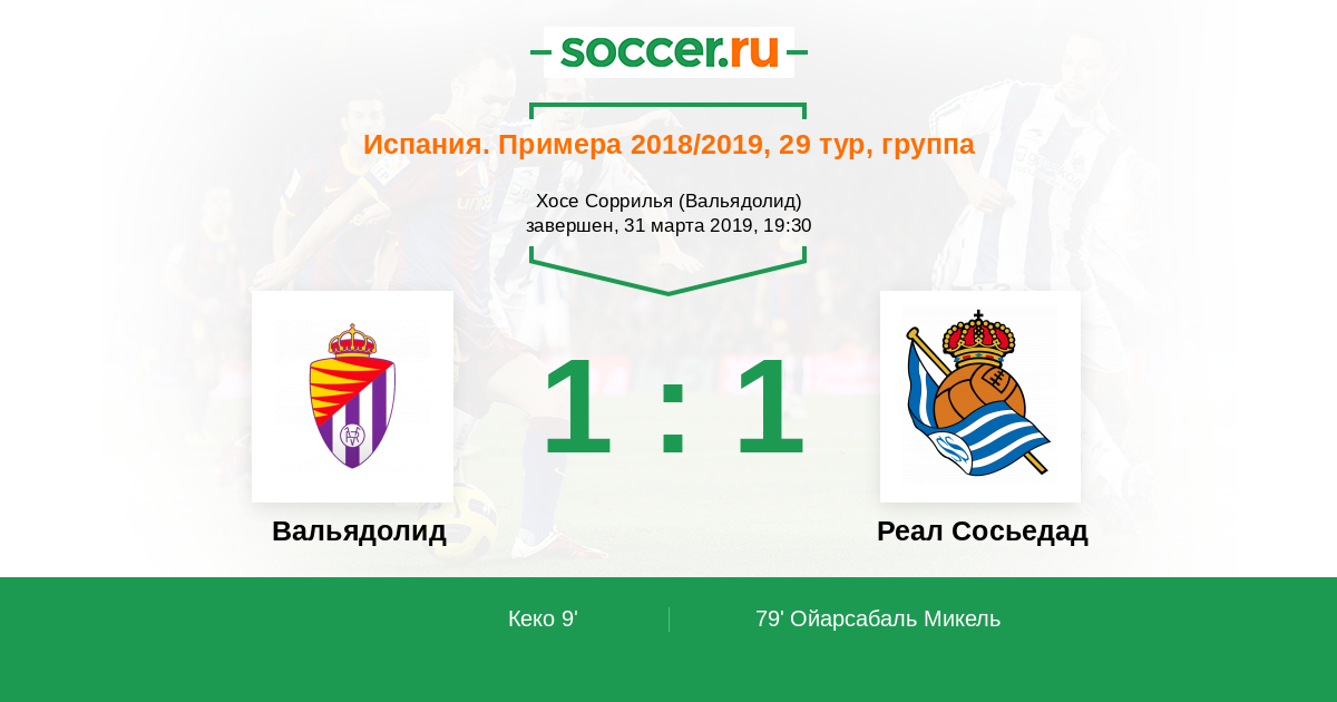Хуанми (Реал Сосьедад) пробил головой по воротам с района 11-метровой отметки после точной верховой передачи, но удару не хватило силы и точности, мяч полетел далеко от левой штанги. Мяч покинул пределы поля. Вальядолид введет мяч в игру ударом от ворот.