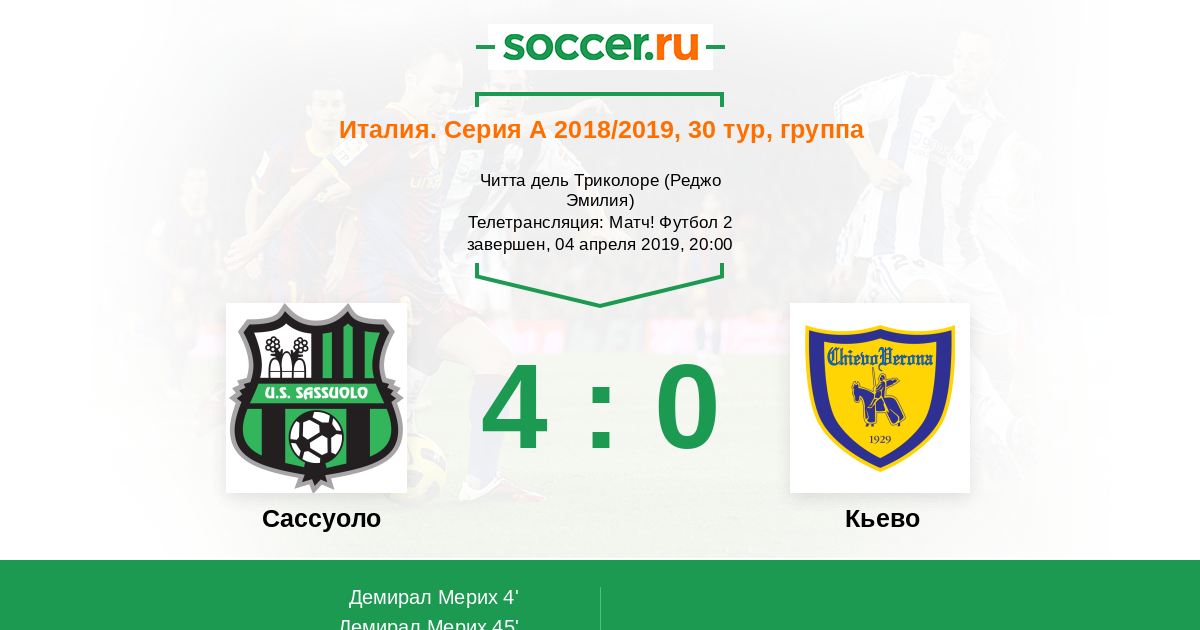 Гол! Хума Бабакар сумел зацепиться за мяч и переправить его на Доменико Берарди (Сассуоло) , который выиграл единоборство и без долгих раздумий пробил в правый верхний угол. 4:0.