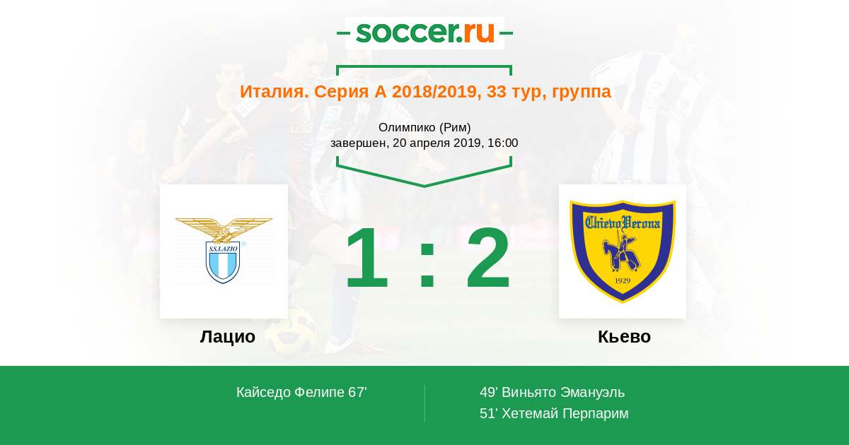 Луис Альберто (Лацио) отдал пас, но мяч оказался там, где никогошеньки нет. Мяч покинул пределы поля. Кьево введет мяч в игру ударом от ворот.