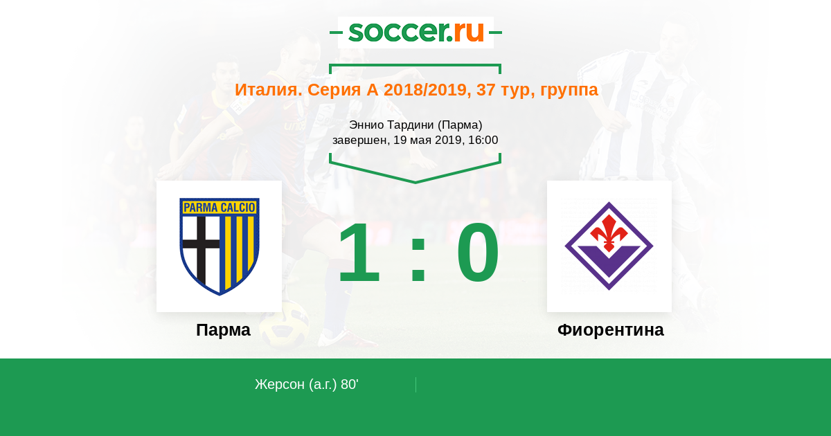 Отличный маневр и умный пас последовал на Giovanni Simeone (Фиорентина), который нанес первый удар, но мяч полетел выше ворот. Мяч покинул пределы поля. Парма введет мяч в игру ударом от ворот.