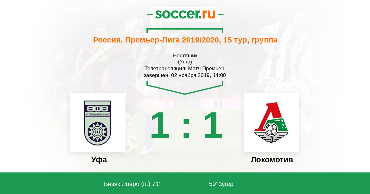 Приветствуем всех любителей российской Премьер-лиги на матче 15-го тура, "Уфа" принимает "Локомотив". Команда Сёмина крупно проиграла в крайнем туре и будет стараться реабилитироваться перед своими болельщиками. В двух последних матчах "Уфа" не забивала, но ждать ли такой пассивности в атаке от "горожан" в игре с "Локомотивом"? Сайт https://www.soccer.ru проведёт прямую текстовую онлайн трансляцию матча, следить за событиями на поле и комментировать игру для вас будет Старчеус Сергей.
