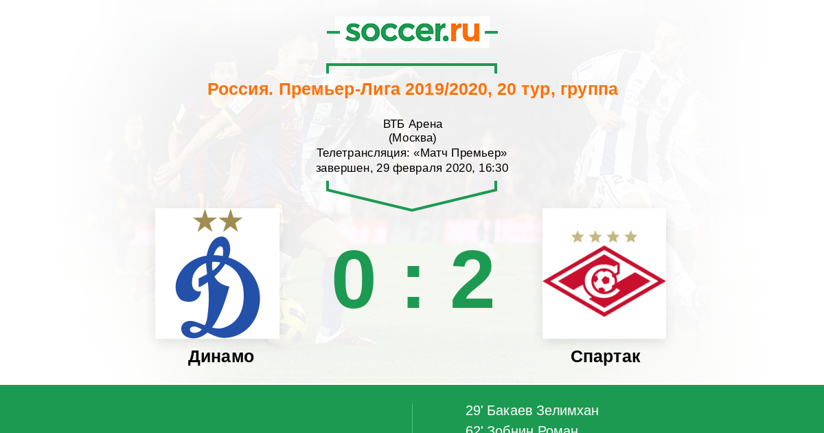 Все! Матч завершен! "Спартак" одержал выездную победу над "Динамо" со счетом 2:0 благодаря голам Зелимхана Бакаева и Романа Зобнина. Для Вас прямую онлайн-трансляцию этого поединка провел Андрей Бабенчук. Оставайтесь на https://www.soccer.ru/!