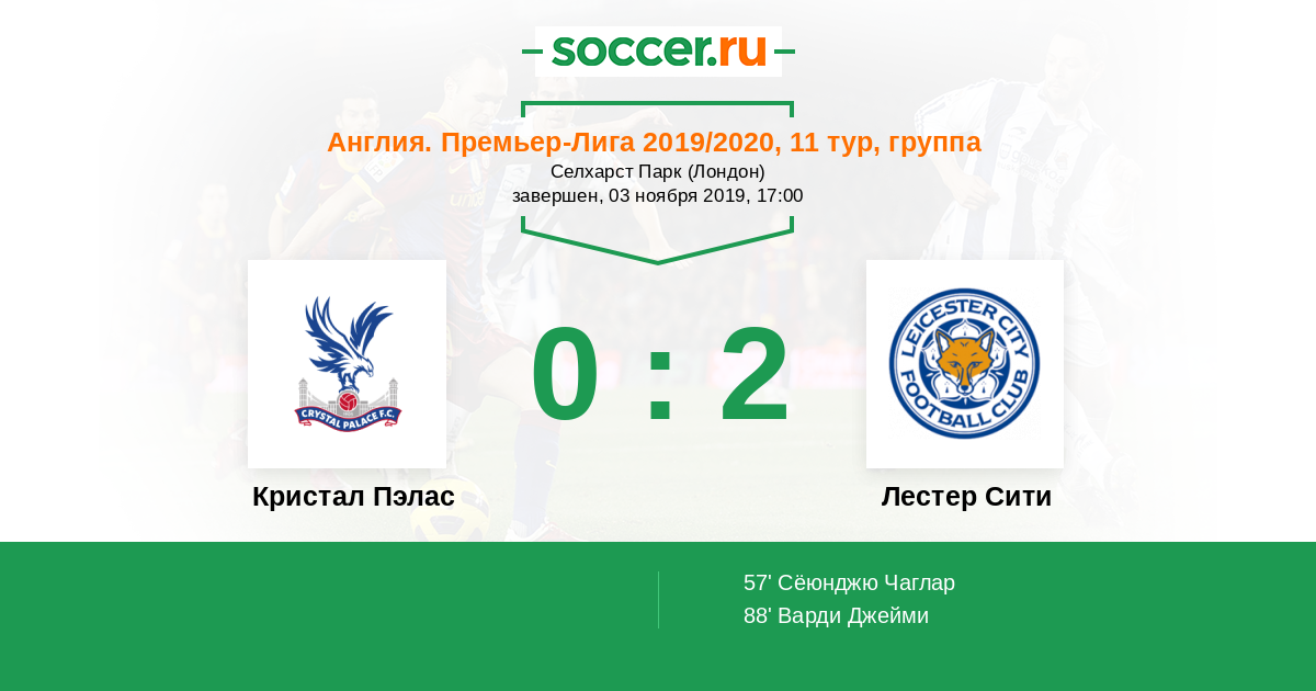 Рикарду Перейра (Лестер Сити), пытаясь добраться до мяча, грубо ударил соперника по ногам. Пол Tierney свистнул нарушение. Кристал Пэлас получает штрафной удар у линии поля.