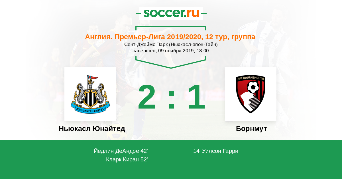 Джошуа Кинг (Борнмут) принял короткий пас и попытался переиграть голкипера из средней линии, но мяч пролетает впритирку с правой штангой. Мяч покинул пределы поля. Ньюкасл Юнайтед введет мяч в игру ударом от ворот.