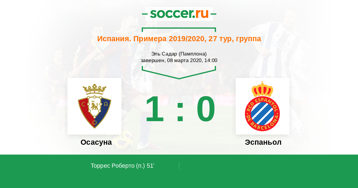 Роберто Торрес (Осасуна) не смог реализовать штрафной, который был назначен вблизи ворот. Чуть выше перекладины пролетел снаряд. Мяч покинул пределы поля. Эспаньол введет мяч в игру ударом от ворот.