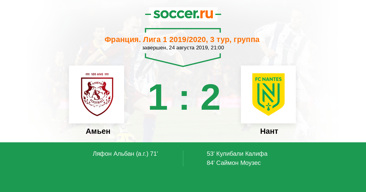 укас Лима (Нант) поборолся за мяч после штрафного удара и смог пробить, находясь на углу штрафной площади. С такой дистанции надо забивать, но мяч прошел в нескольких сантиметрах мимо ворот. Мяч покинул пределы поля. Амьен введет мяч в игру ударом от ворот.