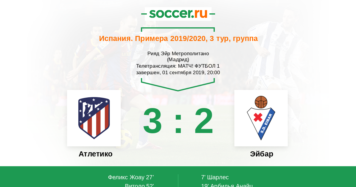 Виктор Витоло (Атлетико) попытался сделать точную передачу, но Томас Лемар не смог достать мяч - слишком сильный пас. Мяч покинул пределы поля. Эйбар введет мяч в игру ударом от ворот.