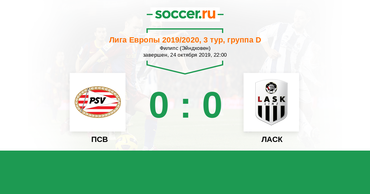 Марвин Potzmann (ЛАСК) нанес удар с края штрафной, но мяч прошел сильно выше ворот. Мяч покинул пределы поля. ПСВ введет мяч в игру ударом от ворот.