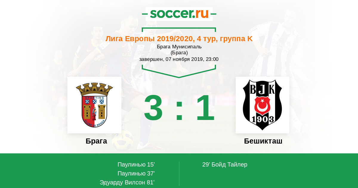 Паулиньо (Брага) сделал все, чтобы достать мяч после навеса, но не достал. Мяч покинул пределы поля. Бешикташ введет мяч в игру ударом от ворот.
