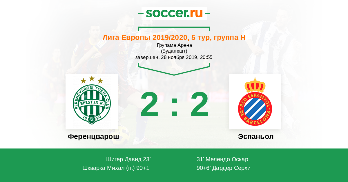 Отличный пас на Роланд Варга (Ференцварош) прошел на линии штрафной площади, и тот пробил в левый верхний угол. Диего Лопес сделал невероятный сэйв в последнюю секунду.