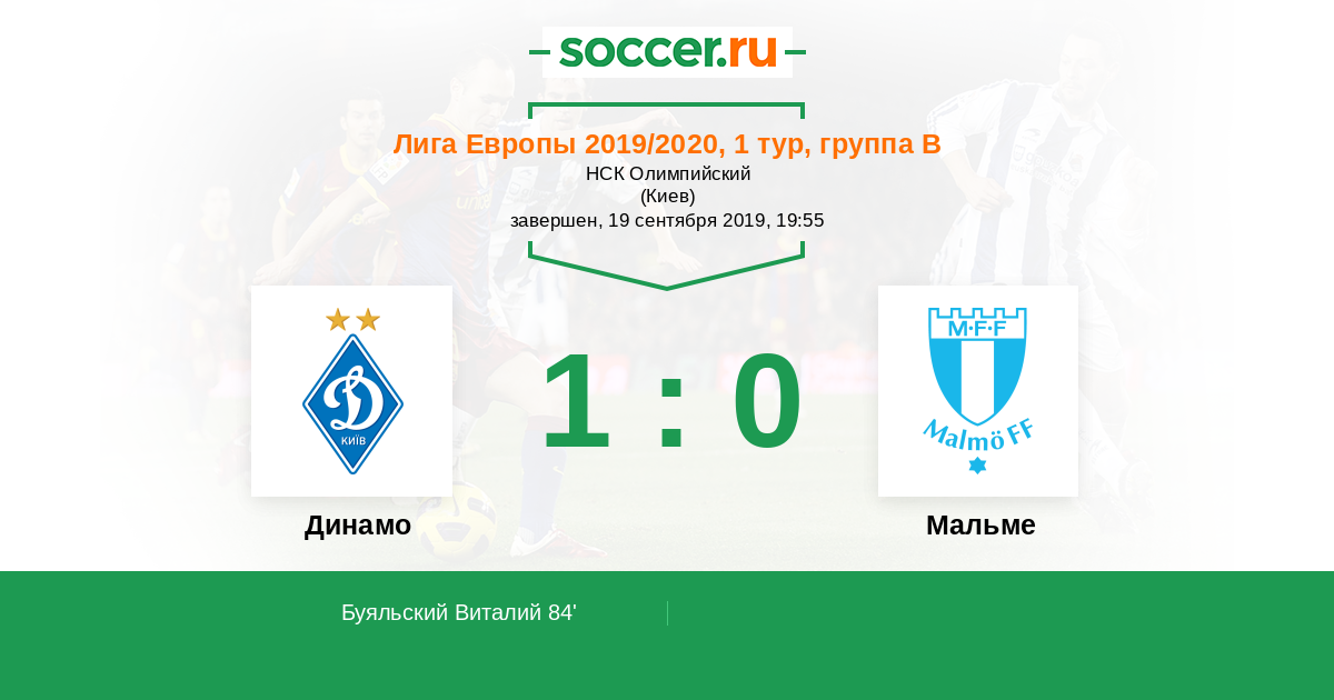 Виталий Буяльский (Динамо Киев) бил с угла штрафной по воротам, но промахнулся. Какая возможность! Мяч покинул пределы поля. Мальмё введет мяч в игру ударом от ворот.