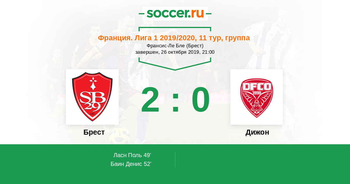 Брест неудачно исполняет этот штрафной. Альфред Гомис (Дижон) удачно прерывает подачу на выходе из ворот.