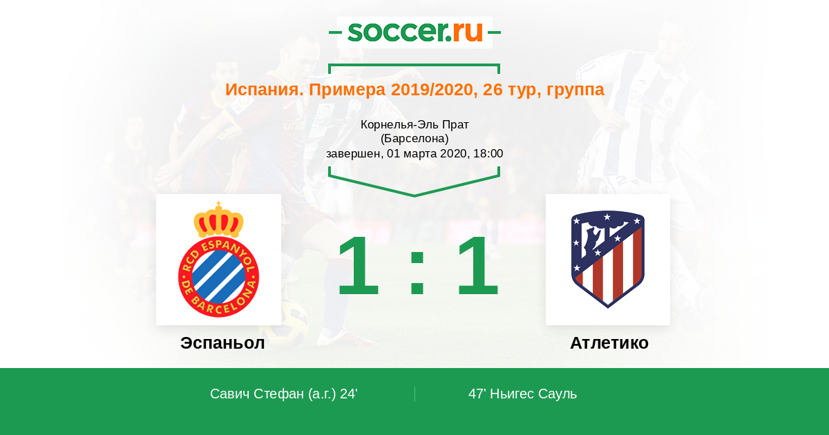 Опасный удар головой наносил Бернардо (Эспаньол) с точки пенальти, но промахнулся. Угловой не изменил счет в матче. Мяч ушел за линию ворот, и вратарь команды Атлетико произведет удар от ворот.