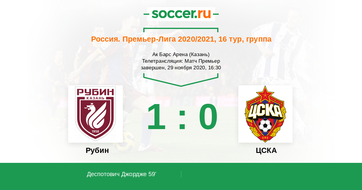 Приветствуем всех поклонников российской Премьер-лиги на матче 16-го тура, в котором "Рубин" принимает ЦСКА. Хозяев поля оказались в более выгодном положении. Они ощутят поддержку трибун, да и времени у них было больше на подготовку к поединку. ЦСКА играет в плотном графике и сегодняшний матч для них будет чрезвычайно сложным. Кто по итогу встречи возьмёт три очка? Сайт https://www.soccer.ru проведёт прямую текстовую онлайн трансляцию матча, следить за событиями на поле и комментировать игру для вас будет Старчеус Сергей.