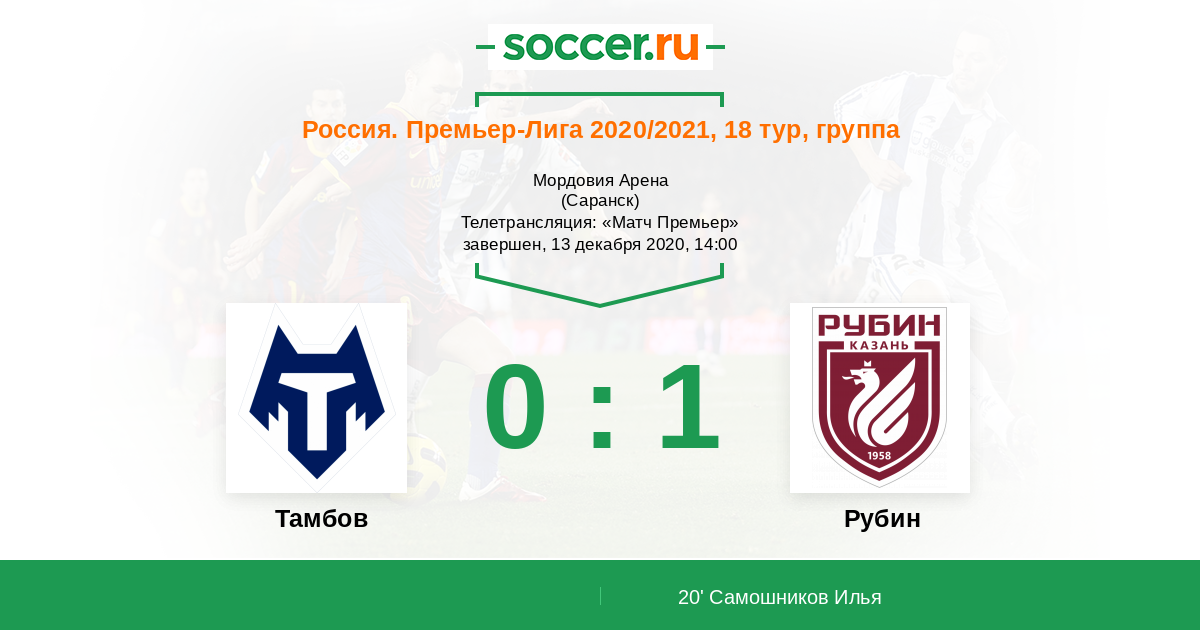 Добрый день всем любителям футбола! Рады приветствовать Вас на матче 18-го тура российской Премьер-лиги, в котором на стадионе "Мордовия Арена" в Саранске сыграют "Тамбов" и "Рубин".
