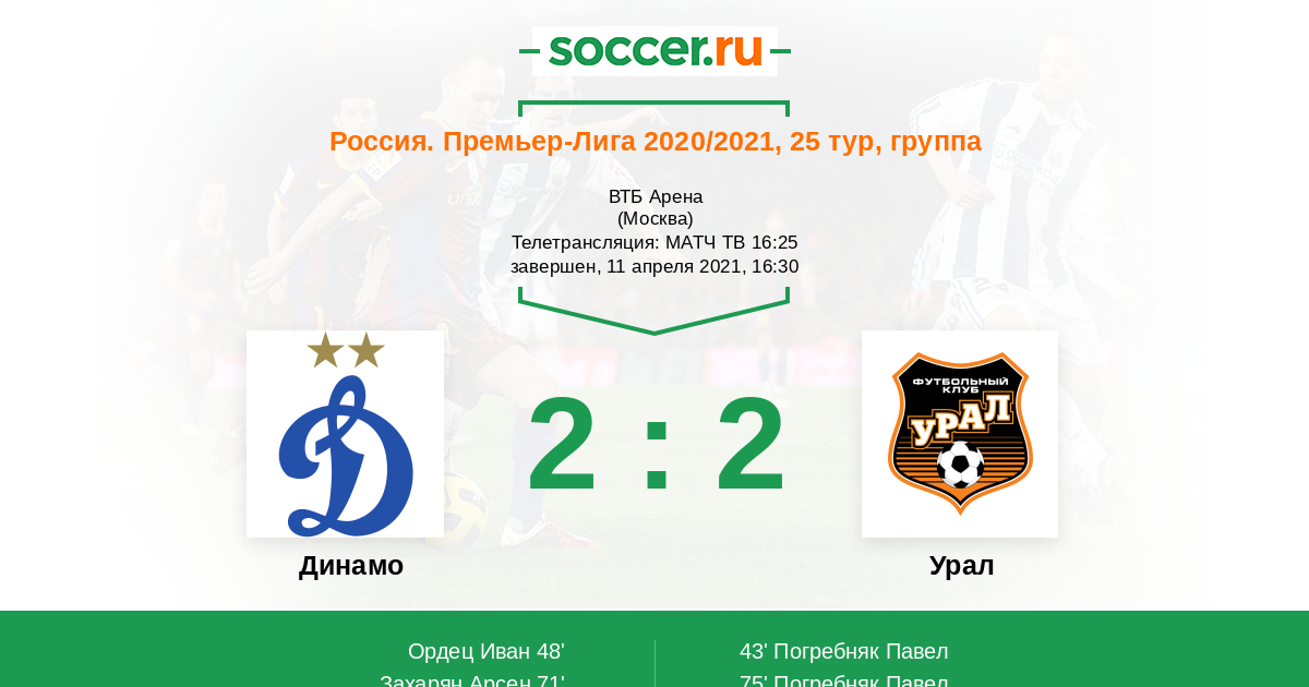 Приветствуем всех поклонников российского футбола! Столичное "Динамо" в 25-м туре чемпионата России сыграет против "Урала". Учитывая то, как "шмели" выступают на выездах, у москвичей есть отличная возможность забрать 3 балла. В шести матчах кряду "Урал" не может победить на выезде, но воспользуется ли этим сегодня "Динамо"? Сайт https://www.soccer.ru проведёт прямую текстовую онлайн трансляцию матча, следить за событиями на поле и комментировать игру для вас будет Старчеус Сергей.