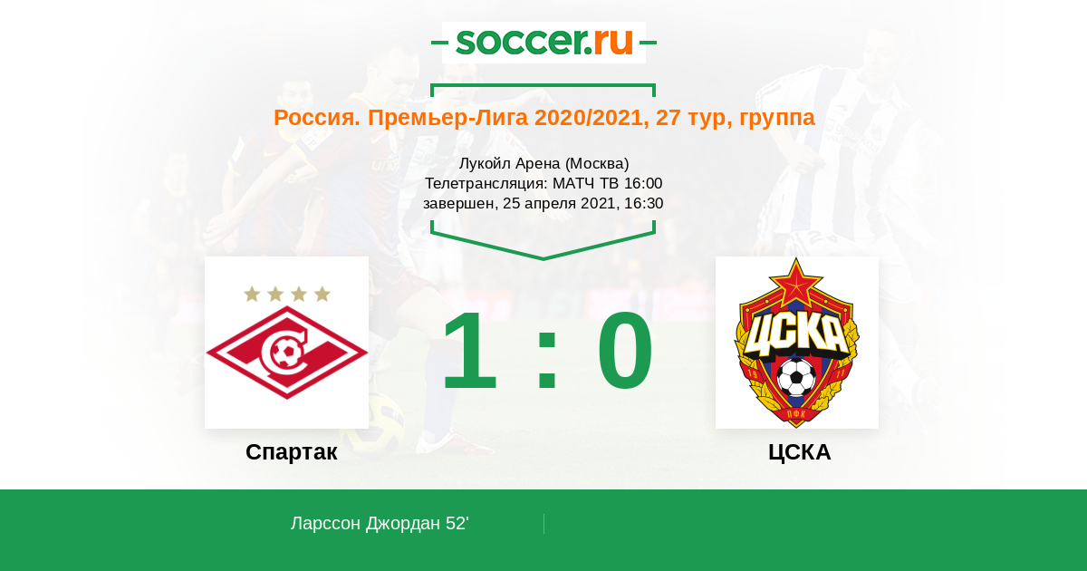 Очень интересный и очень тяжёлый матч получился между "Спартаком" и ЦСКА, победу в котором с минимальным счётом одержали хозяева. Хозяева теперь закрепились на третьем месте и всё-ещё претендуют на попадание в Лигу Чемпионов. Ну а ЦСКА уже на 6-м месте, "армейцам" остаётся только бороться за место в Лиге Европы. Прямую текстовую онлайн трансляцию матча для вас провёл Старчеус Сергей, до новых встреч на https://www.soccer.ru !