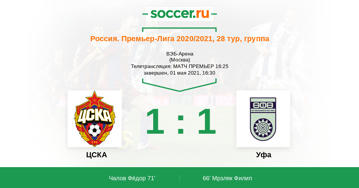 Все! Матч завершен! ЦСКА и "Уфа" расписали на "ВЭБ-Арене" ничью 1:1. Для Вас прямую онлайн-трансляцию этого поединка провел Андрей Бабенчук. Оставайтесь на "Соккер.Ру"!