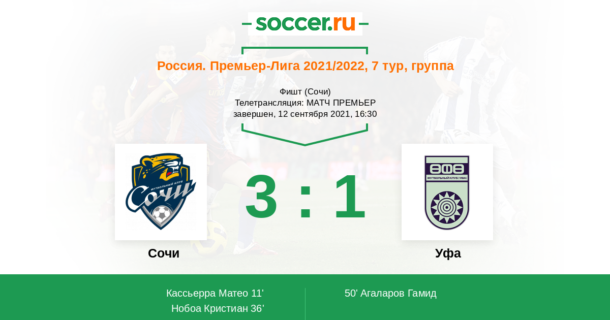Приветствуем всех любителей российского футбола на матче 7-го тура РПЛ между "Сочи" и "Уфой". Команды, решая разные задачи, остро нуждаются в набранных очках. Хозяева поля ведут борьбу за место в зоне Лиги чемпионов, а гости пока не могут выбраться из низов турнирной таблицы. "Сочи" выиграл два последних домашних матча, но станет ли следующей жертвой "барсов" "Уфа"? Сайт https://www.soccer.ru проведёт прямую текстовую онлайн трансляцию матча, следить за событиями на поле и комментировать игру для вас будет Старчеус Сергей.