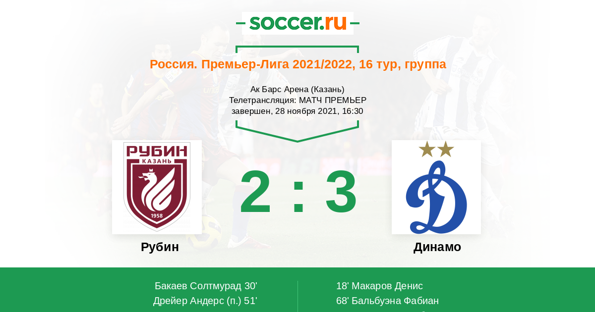Все! Матч завершен! "Динамо" на выезде в зрелищном поединке обыграло "Рубин" со счетом 3:2. Для Вас прямую онлайн-трансляцию этого поединка провел Андрей Бабенчук. Оставайтесь на "Соккер.Ру"!