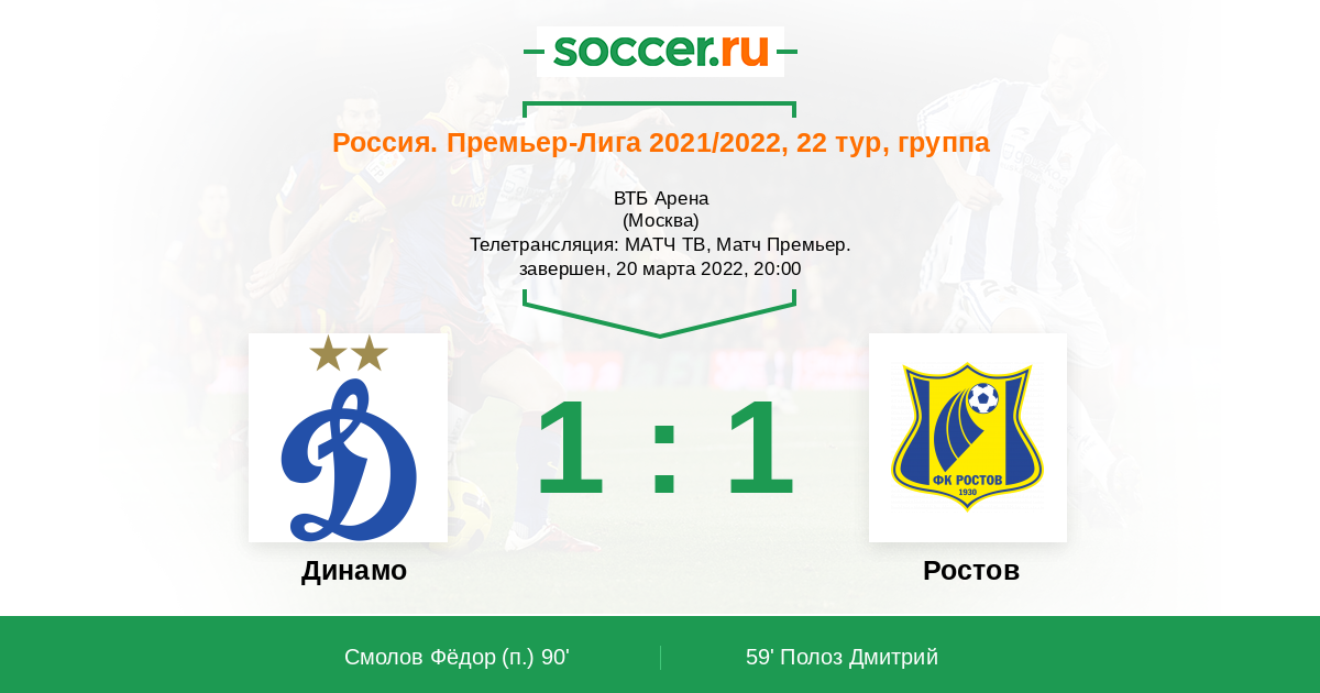Добрый вечер, уважаемые любители российского футбола! Одним из центральных матчей 22-го тура РПЛ станет игра на "ВТБ Арене", где "Динамо" сыграет против "Ростова" Валерия Карпина. Соперники, зарядившись позитивом в предыдущем туре Премьер-лиги, сделают всё возможное для закрепления успеха. Командам важно не сворачивать с победного пути. В пяти последних домашних матчах "Динамо" не проигрывало "Ростову", но продолжится ли эта серия после сегодняшнего матча? Сайт https://www.soccer.ru проведёт прямую текстовую онлайн трансляцию матча, следить за событиями на поле и комментировать игру для вас будет Старчеус Сергей.