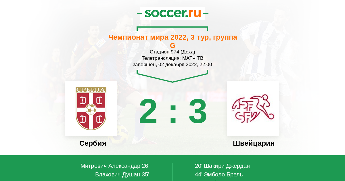 Добрый вечер, всем любителям футбола! Сегодня на Чемпионате мира завершается третий тур группового этапа. В одном из двух матчей группы "G" сыграют между собой Сербия и Швейцария. Положение дел таково, что сербам надо только побеждать, но хватит ли им сил сыграть на победу против дисциплинированных швейцарцев? Сайт https://www.soccer.ru проведёт прямую текстовую онлайн трансляцию матча, следить за событиями на поле и комментировать игру для вас будет Старчеус Сергей.