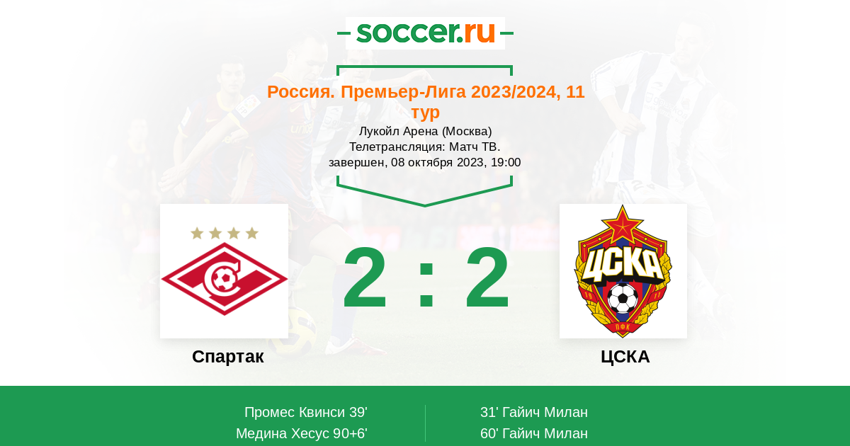 Сегодня как всегда будет горячее противостояние двух непримиримых соперников. "Спартак" будет сверх мотивирован, особенно после разгромного поражения (0:4) в Самаре. ЦСКА захочет наконец-то прервать неудачную серию в очных матчах, так что накал страстей и интрига будут держать нас весь матч. Александр Соболев на эту игру дисквалифицирован, но у красно-белых хорошая обойма, достойная замена нападающему найдётся. С нетерпением ждём стартового свистка на "Открытие Арене".