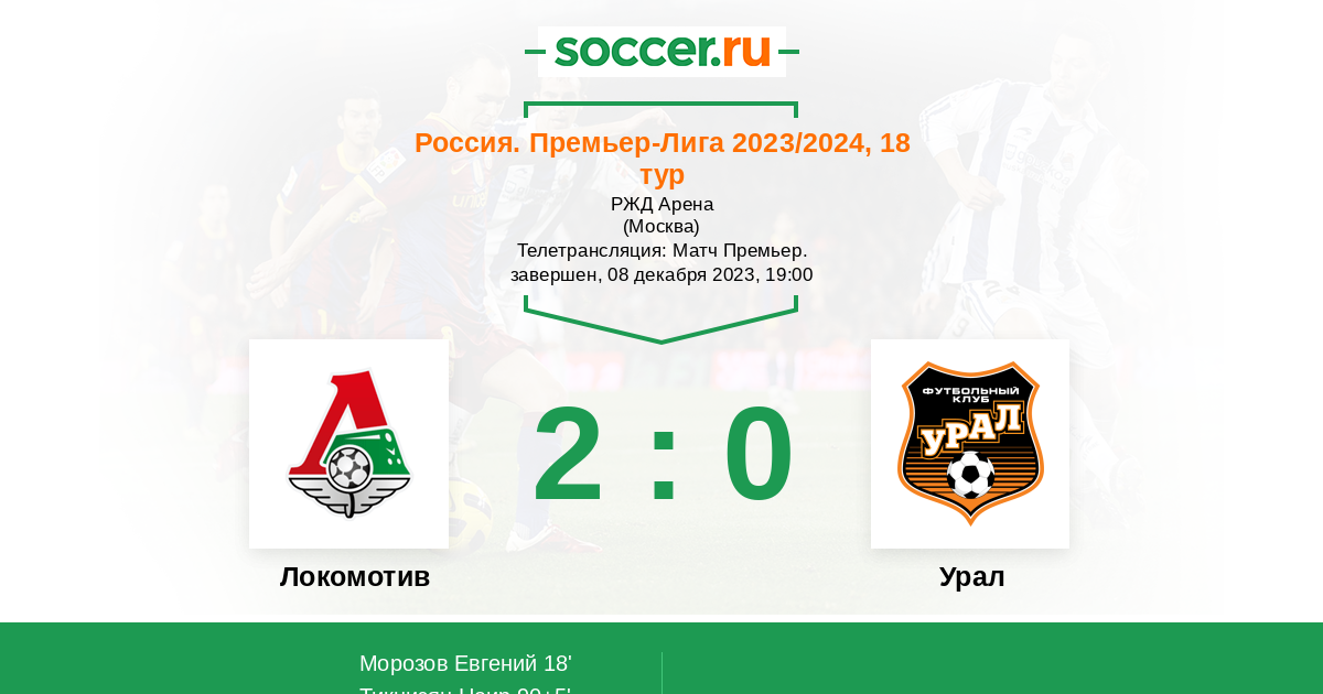 Добрый вечер, уважаемые любители российского футбола! Сегодня будет открыт 18-й тур РПЛ, "Локомотив" на своём поле сыграет с "Уралом". В двух последних очных играх "железнодорожники" не побеждали, но сейчас они набрали хороший ход и постараются уйти на зимнюю паузу одержав сегодня победу. Сайт https://www.soccer.ru проведёт прямую текстовую онлайн трансляцию матча, следить за событиями на поле и комментировать игру для вас будет Старчеус Сергей.