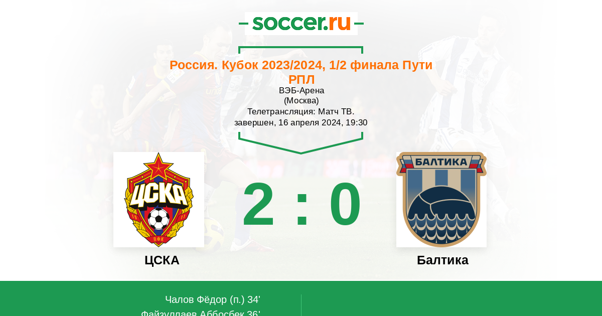 Приветствуем всех любителей футбола! Этот вечер начнётся ответным матчем 1/2 финала Кубка России Пути РПЛ, в котором ЦСКА на своём поле сыграет с "Балтикой". В первой игре "армейцы" победили со скромным счётом 1:0, получится ли у гостей отыграться и сенсационно выйти в финал? Сайт https://www.soccer.ru проведёт прямую текстовую онлайн трансляцию матча, следить за событиями на поле и комментировать игру для вас будет Старчеус Сергей.