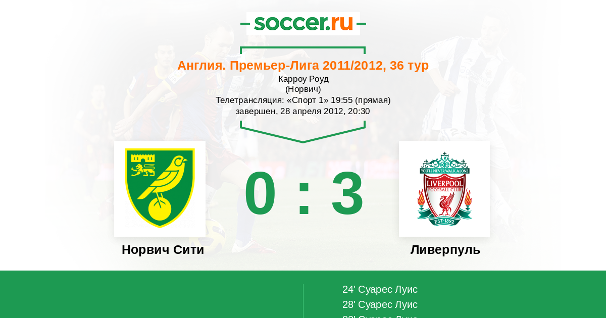 Мы приветствуем Вас на матче 35-го тура английской Премьер-лиги, в котором "Норвич" принимает "Ливерпуль". Прямую текстовую трансляцию проведет комментатор Soccer.Ru Антон Сазонтов. Добро пожаловать!